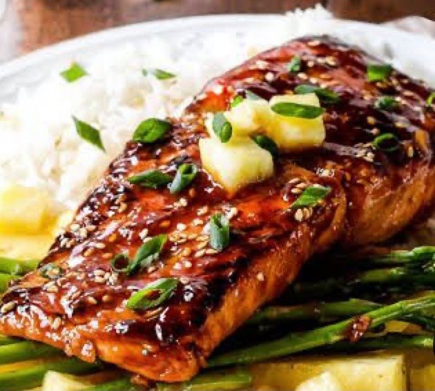 Filet de saumon mariné à l’orange et à l’érable, riz crémeux et légumes